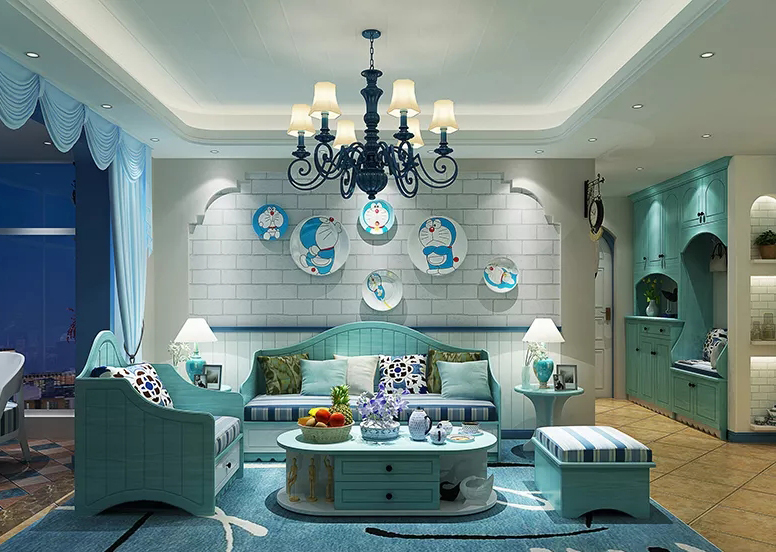 将白色文化砖与蔚蓝色的沙发、茶几搭配在一起,可给人清新自然的感觉,仿佛置身在海边,舒适清爽。