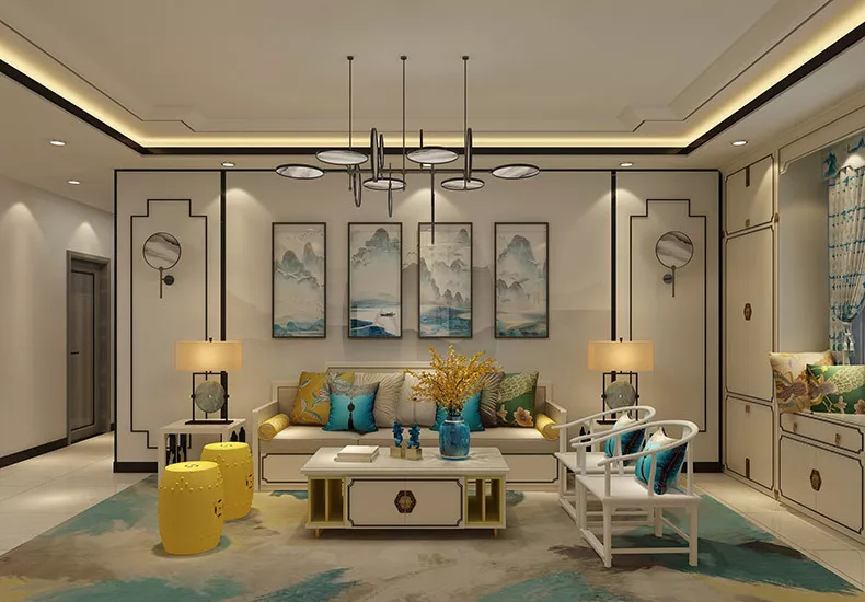 像这个运用四幅山水画构成的背景墙,与沙发抱枕、地毯相互呼应,格调一致,又很有意境和韵味。